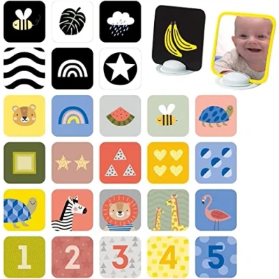EbebekFor Easier Development and Easier Parenting! Set of 30 images, baby-safe mirror & 2 unique stands to support upright cards position for tummy time play. Printed with environmentally friendly soy ink, without any smell. BPA-free, PVC-free, Phthalate-free. Size: 5.5"x5.5" / 13.5x13.5 cm Suitable from birth. Using flashcards helps to link creation in the brain and stimulates the identification of objects, strengthens memorization, Improves fine motor skills, Enhances visual memory & Increases confidence.