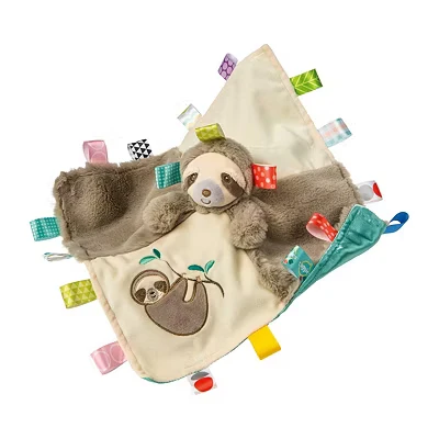 TOY & BLANKET IN ONE: Soft toy sloth atop attached 33 x 33-centimeter blanket with colourful tags that pop; molasses has embroidered eyes and a sweet smile SOFT FOR CUDDLING: Blanket top is squares in neutral colour palette and applique of a sweet-faced sloth; features aqua satin lining underneath TAGS BABIES LOVE TO EXPLORE: Adorned with interactive and soothing satin loop tags for baby's sensory delight; use character blanket as a comforting lovey, or for playing peekaboo MACHINE WASHABLE: Care for by washing in cold water on gentle cycle, air dry PREMIUM BABY SHOWER GIFTS: Combine with baby mat, soft toy, and rattle from the Molasses Sloth collection by Taggies