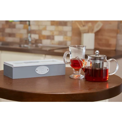 ManoManoGeneral description This 3 compartment tea storage box features a rectangular, sectioned base in muted grey, designed to keep different tea bags organized. It is topped with a white framed, clear glass lid that stylishly displays the contents stored inside.