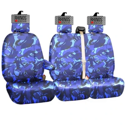 Tailored Ford Transit Custom Seat Covers 2013 2023 Driver & Double Passenger with Tray Flap Arm Rest Heavy Duty Waterproof Polyester Nylon Leather Quilted Diamond (Blue Camouflage)