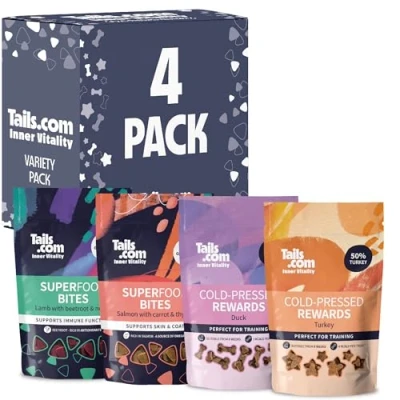 Tails.com Inner Vitality Dog Treats Variety Pack 4 x 70/80g Superfood Bites 27% Lamb, 28% Salmon, 50% Duck, Turkey Grain Free Recipe No Artificial Colours or Flavours Low Calorie Snacks