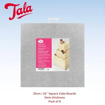 CAKE BOARD: The most traditional way of displaying a freshly baked cake 3MM THICKNESS: These Cakes Boards are made to 3mm thickness which is perfect for use with Victoria Sponges and other light cakes and pastries MULTIPACK:This pack include a pack of 6 Cake Boards, each board measures 25x25cm EMBOSSED SILVER FOIL: These Cakes Boards have a embossed silver foil finish which gives a great background for any freshly baked Cake TALA: Known and trusted for Baking and Icing products since 1899