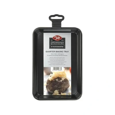 This Tala Performance quarter baking tray is made from heavy duty carbon steel and features rolled edges to provide extra strength in the oven and whilst in use.The quarter baking tray has a durable non-stick coating for perfect results every time which is not only PFOA and BPA free but the glossy finish gives it a premium feel and appearance.The tried and tested Tala Performance bakeware boasts even heat distribution and is suitable for oven temperatures up to 240°C. Suitable for storage in the fridge and freezer and dishwasher safe for easy and convenient cleaning.Dimensions: 2(H) x 13.5(W) x 23.5(D)cm.