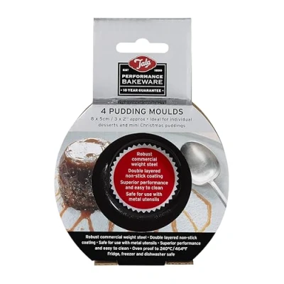 Harts of SturThis Tala Performance set of 4 pudding molds are made from heavy duty carbon steel and features rolled edges to provide extra strength in the oven and whilst in use.These 4 pudding molds have a durable non-stick coating for perfect results every time which is not only PFOA and BPA free but the glossy finish gives it a premium feel and appearance.The tried and tested Tala Performance bakeware boasts even heat distribution and is suitable for oven temperatures up to 240°C. Suitable for storage in the fridge and freezer and dishwasher safe for easy and convenient cleaning.Dimensions of each tin: 8(H) x 5(W) x 5(D)cm.