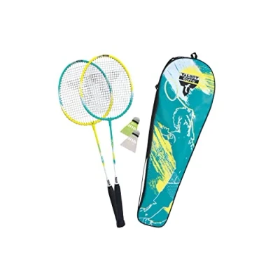 2 quality rackets with hardened aluminum heads (20g lighter than steel ones) and steel shafts (each approx. 100g total weight). Lighter racket = better handling = easier to play The head and shaft are connected by a high-quality, stable, durable, fully enclosed T-piece that cannot be bent Hardcover multifilament string for optimal playing fun (controlled play and no ball getting stuck in the string): all contact points with the frame are protected by eyelets 2 plastic shuttlecocks with cork base, in a dimensionally stable box for safe storage (no flattened balls) Includes game instructions, all packed in a valuable zippered bag with adjustable carrying strap
