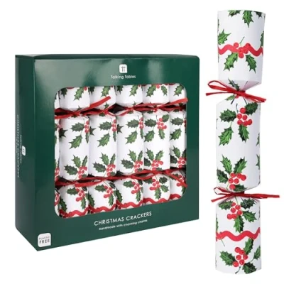 Set of 12 Holly Christmas Crackers – 12 inch festive crackers with a traditional holly, berry and red ribbon design. Perfect as Christmas table decorations, party favours and luxury crackers for family gatherings and Christmas celebrations. Each cracker includes a drink charm gift, paper hat, and scroll packed with jokes, trivia, charades, spelling bee, tongue twisters and hum-that-tune challenges for festive fun and entertainment. Luxury 12 inch Christmas crackers with reusable drink charms – decorative and practical table favours that can be kept and reused. Ideal for Christmas dinner parties, family gatherings and festive celebrations in the UK. Eco-friendly Christmas crackers – 100% plastic free and recyclable, made with sustainable materials. A responsible choice for eco Christmas decorations, zero waste Christmas dining and environmentally friendly festive tableware. Talking Tables Holly crackers combine traditional festive design with eco values. These recyclable crackers bring laughter, fun and games to your table while also serving as Christmas decorations and conversation starters., Manufacturer: Talking Tables