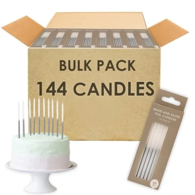 Talking Tables 144 x White and Silver Birthday Candles with Holders 12cm Long & Tall Bulk Pack Cake Decorations for Birthday, Wedding, Anniversary