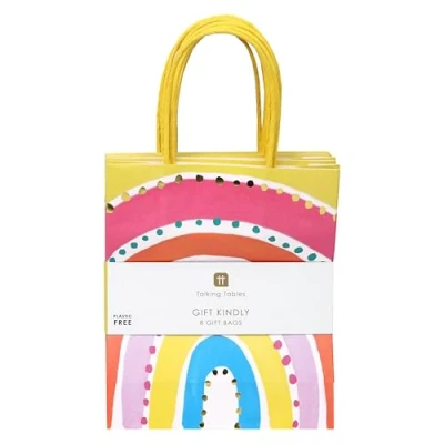 Vibrant Design: Bright rainbow colours make these gift bags ideal for any festive occasion. Perfect for children's parties, weddings, and other events requiring fun flair. Eco-Friendly Choice: Made from recyclable, plastic-free paper with strong handles, our bags ensure an environmentally conscious gifting experience every time. Durable Quality: Crafted to a high-quality standard, these bags are designed to be durable and reusable, offering a premium touch to your gift-giving approach. Generously Sized: Each pack contains 8 medium-sized gift bags, sized 28cm x 16cm with handles, ideal for carrying presents, sweets, and party favours effortlessly. Trusted British Brand: As a leader in sustainable, stylish partyware, Talking Tables always delivers innovative products that enhance every occasion.