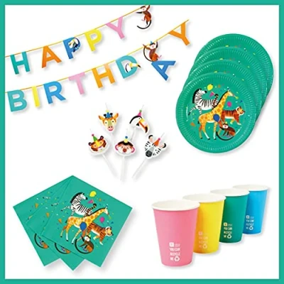 Use this Jungle Party Tableware Set by Talking Tables to ensure your little one has a wild birthday! Perfect for boys or girls with jungle animals including a Zebra, Giraffe, Tiger and Monkey OCCASION - This disposable party tableware and matching birthday party decorations are ideal for a kid's animal party, jungle theme party or safari party CONTENT - Suitable for 8 people, this animal party set includes 20x Animal Napkins, 8x Jungle Party Plates, 8x Party Cups, 5x Animal Candles and 1x 3.5m Happy Birthday Bunting MIX & MATCH - Check out our 'Party Animals' range for matching animal party bags, animal masks, party invitations and thank you cards just to name a few. These can be found in our Amazon store. 📷 SHARE - We would love to see your party snaps, please do upload pictures of your celebration or occasion, Manufacturer: Talking Tables