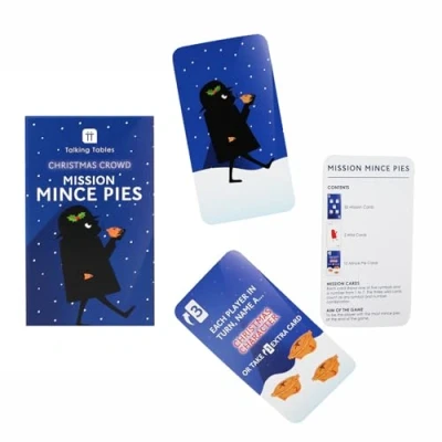 Talking Tables Mince Spies Christmas Game for Kids Xmas Activity Stocking Filler Festive Season Spy Coaster Game, 18 Pie-Shaped Missions for Dinner Party Fun, 3+ Players, Ages 14+ ABOUT THE PRODUCT: Mission Mince Pies Christmas Game – A lighthearted festive party game that tests players’ food and drink knowledge with a Christmas twist. Compact and easy to play, it’s perfect for adding fun to the dinner table or entertaining guests throughout the holidays. With a charming festive box for storage, it’s reusable year after year and suitable for all ages, making it an ideal choice for Christmas gatherings. AGES: 8+ PLAYERS: 3+ BRITISH BRAND: Talking Tables Head Office is based in London; we are a small friendly team working hard to make your gatherings extra special., Manufacturer: Talking Tables