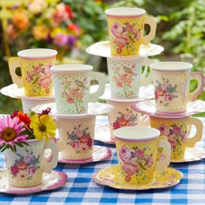These pink, yellow and mint green floral paper cups and saucers are disposable meaning there's no washing up or breakages! Simple pop in the bin and enjoy the extra time to spend with guests. Part of our famous Truly Scrumptious Range of Afternoon Tea Party Supplies and Afternoon Tea Decorations. SIZE - Each pack contains 24 paper tea cups and saucers in 3 elegant and colourful floral designs. Cups size - 8cm and saucer - 15cm OCCASION - Perfect for a kid's tea party, birthday, baby shower, afternoon tea party or a Bridgerton themed party! Not suitable for hot drinks. MIX & MATCH - To complete the look we also stock party plates, floral napkins and tea party decorations in the same Truly Scrumptious design. Visit our Amazon Store to view all our fabulous and fun tableware and partyware and party decorations ECO - All plastic has been removed from packaging meaning it can be easily recycled