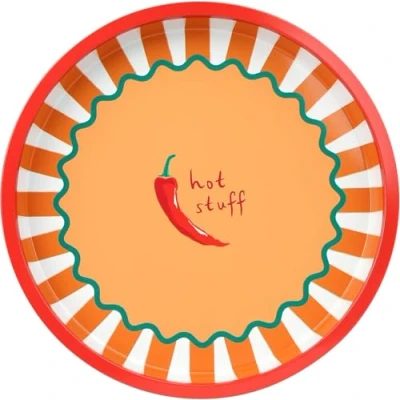 Talking Tables Round Serving Tray Chilli Design for Tea Coffee, Drinks Food Sandwiches Decorative Design BBQ, Birthday, Tin Tableware 30cm ABOUT THE PRODUCT: Turn up the heat on your serving style with this 30cm Hot Stuff Chilli Tin Tray, featuring bold retro chilli artwork. Lightweight, durable, and easy to wipe clean ideal for BBQs, themed dinners, or spicy snack spreads. A must-have for chilli fans and stylish hosts alike. ECO: ALL Talking Tables products are made to be either reusable or home recyclable and this include both product and packaging! QUALITY: Our products are made to the highest quality standard and are sold in many premium high street shops in the UK and internationally. BRITISH BRAND: Talking Tables has become the go-to brand for innovative, sustainable, and design-led products that add fun and style to every occasion., Manufacturer: Talking Tables