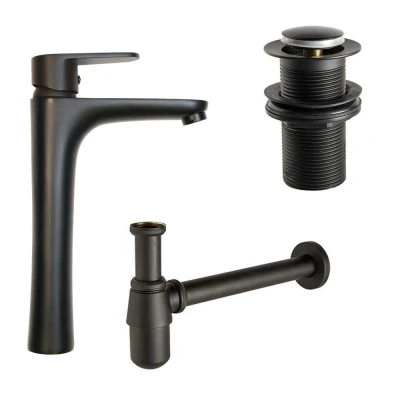 Add a contemporary flair to your bathroom or en-suite with the Matt Black Tall Mixer Basin Tap bathroom set. This simple yet fashionable freestanding tap stands 280mm tall with a spout distance of 140mm from the back, making it perfect for modern bathroom set ups and providing enough room for comfortable washing. It includes a half-turn mono-block mixer and comes with 2 x 50cm braided stainless steel water inlet hoses and durable basin fixings for straightforward installation.Additionally you are supplied with a non slotted waste and black bottle trap you know will match. Its internal ceramic cartridge ensures reliability and provides seamless and accurate water control. Compatible with medium to medium/high-pressure systems with a minimum requirement of 0.5 bar pressure, this mixer tap guarantees a consistent flow every time.Features & Benefits: Tall Matt Black Basin Mixer Tap with Non Slotted Waste & Black Bottle Trap, A 280mm tall freestanding half-turn mono-block mixer tap set, Gives consistent water flow every time, Striking matt black finish to give contrast with white basins for a sleek edge in bathroom d©corKit Contents, 1 x Matt Black Tall Bathroom Mixer Tap, 1 x Black Non Slotted Waste, 1 x Black Bottletrap. Tall Matt Black Basin Mixer Tap with Non Slotted Waste & Black Bottle Trap Clickbasin