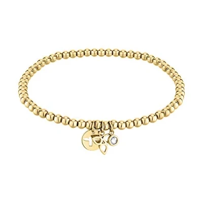 Cool beads bracelet from Tamaris with flower pendant and zirconia stone Material: beads made of stainless steel IP gold polished, zirconia stone. Size: 17 cm. Band: drawstring Packaged in an original Tamaris gift box. The Tamaris jewellery and watch collection impresses with its timeless design in high quality. Perfect as a gift for your favourite people