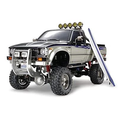 The ABS pick-up truck body has numerous details and light inserts The kit contains a surfboard with three possible decoration variants The coarse off-road tyres ensure particularly good traction The remote controlled vehicle is powered by 4x4 Length: 508 mm, width: 216 mm, height: 270 mm, weight: approx. 3,100 g, Manufacturer: Tamiya