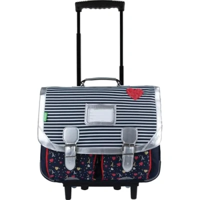 Trolley 41 cm suitable for primary school classes from CE2 to CM2 very resistant and designed to last. Main material: recycled polyester, from recycled plastic bottles. Trolley equipped with 2 compartments that can accommodate 24 x 32 cm notebooks and documents in A4 format. Front zip pockets Reinforcements in corners and under the school bag. 2 x 2 wheels Ergonomic and comfortable back and shoulder straps The straps can be removed to store them in the designated space