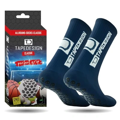 TAPEDESIGN FOOTBALL SOCKS (CLASSIC) - Our special all-round anti-slip "Classic" socks are functional and innovative. Made with a unique material composition of 55% cotton, 35% nylon, 7% spandex, and 3% polyester, these socks offer exceptional comfort and elasticity. They adapt ergonomically to every foot shape, providing a perfect fit. ONESIZE FROM 5 TO 14 - Thanks to individual rubber studs, our sports socks offer maximum grip during your entire sports session and are non-slip. The football socks have a one-size-fits-all fit for shoe sizes 5 to 14 and adapt to the shape of your foot thanks to specially selected materials. BREATHABLE & COMFORTABLE - The special material composition of the socks, in addition to the rubberised studs, ensures an excellent and comfortable fit in the shoe. In addition, the football socks are breathable due to the selected materials and prevent unpleasant perspiration odour. SPECIAL MATERIALS - Due to their unique material composition, our socks are moisture-regulating, breathable, resistant and easy-care. They are skin-friendly, hard-wearing and have a high-quality finish. Our anti-slip socks adapt to the shape of your feet and guarantee a comfortable feeling when playing football, rugby, running, tennis, basketball, handball, hiking or jogging. THIS IS TAPEDESIGN - Our sports socks and many other products are developed and designed in Graz, Austria. The products are worn by professional and amateur athletes in all kinds of sports. The football elite trusts in non-slip socks from Tapedesign.