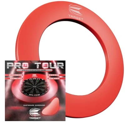 PRO TOUR DARTBOARD SURROUND: Complete your setup with the Pro Tour Dartboard Surround, designed to perfectly fit around your steel tip dart board. COMPATIBLE WITH ALL COMPETITON-STANDARD DARTBOARDS: This premium surround fits securely around any competition-standard steel tip dartboard, offering wall protection and a polished look. EASY DART BOARD INSTALLATION: No wall fixings are required to install this surround, simply clip into place around the dartboard for additional wall protection against stray darts. DURABLE MATERIAL & LIGHTWEIGHT CONSTRUCTION: Made from an Active Reflex Polymer material which prevents unsightly penetration marks, featuring a ribbed back design for improved strength and lightweight structure. PACK CONTAINS: 1x Target Darts Pro Tour Dartboard Surround. Compatible with any competition-standard dartboard.
