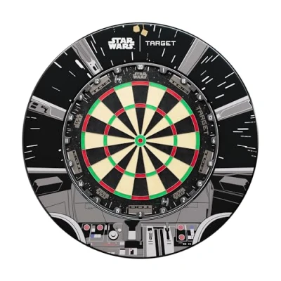 AmazonSTAR WARS | TARGET STEEL TIP DARTBOARD SETUP: Experience the STAR WARS | TARGET Darts TOR Dartboard & Millennium Falcon Surround Bundle, created in collaboration with The Walt Disney Company. MILLENNIUM FALCON STAR WARS DESIGN: Inspired by the Falcon’s cockpit, the surround frames your board with a cinematic view out into the galaxy, while the TOR dartboard beneath delivers competition-level performance. HIGH PERFORMANCE TOR DART BOARD: Constructed from premium Madagascan sisal for exceptional self-healing, a sanded flawless playing surface, and bold graphics for improved visibility and accuracy. The Peak-Fix lock & level system with adjustable feet for secure mounting on uneven walls. ULTRA THIN WIRE SYSTEM & ROTATIONAL NUMBER RING: Innovative number ring allows 10 smooth rotations at 36° per turn, extending board longevity. The stainless steel spiderweb structure is 60% thinner than traditional wiring to reduce bounce outs. PACK CONTAINS: 1x STAR WARS | TARGET TOR Dartboard, 1x Millennium Falcon Surround, and 1x Board Fixing Kit.
