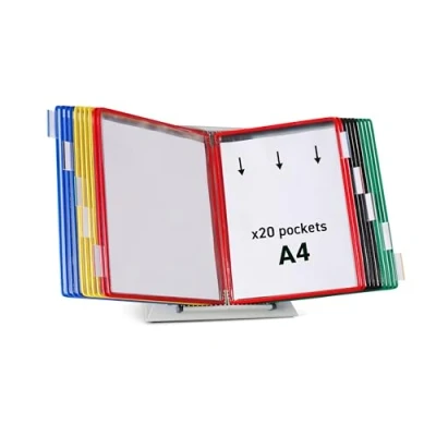 Tarifold desk stand Light grey desk stand complete with 20 A4 pockets in assorted colours Five index tabs for every 10 pages Four side stops to provide required reading angle