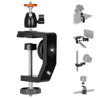 【GREAT COMPATIBILITY】The table mount C-clamp features 4 x 1/4" screw connection points in different directions, catering to different shooting angles. The universal 1/4-inch screw can connect various devices like cameras, lights, camcorders, microphones and others 【USE ANYWHERE】 With a maximum grip range of 1.18in(30mm), this C clamp camera mount offers unlimited possibilities on various surfaces such as workbenches, fences, desks, bikes, car windows, camera tripod stands, and more. Almost everywhere 【FLEXIBLE & VERSATILE】This camera desk mount clamp includes a mini 360° ball head for flexible angle adjustments, securely lockable with a knob. Its sturdy aluminum alloy ball head connects to different devices by standard 1/4" screw/thread for reliable photography/videography setups 【STURDY】Made from aluminum alloy, the super clamp and ball head are lightweight, stable, and durable. Featuring rubber pressure points that protect surfaces and ensure stability. The ball head of this camera mount can support camera gears up to 6.6lbs(3kg) 【PORTABLE】 The C clamp weighs only 0.7lb(320g), making it convenient for on-the-go shooting. It can be attached to desks, car windows, fences, railings or light tripod stands for live streaming, outdoor/hiking/mountain biking/high-road/miniatures photography/videography, social media video making, and more