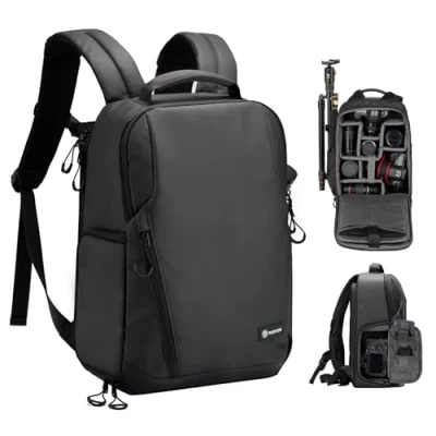 【Large Capacity】Features of camera bag backpack with efficient interior space design, which helps this camera bag provide large capacity for camera equipment (can hold 2 cameras + 5 lenses), accessories and other belongings, while keeping the backpack compact and lightweight. 【Multiple Pockets】A total of 12 compartments and pockets provide a wide range of varieties to store and organize your equipment. The main compartment with rear access can store all your camera and drone gear and the dedicated expandable laptop case on the back cover fits laptops up to 14". The spacious front compartment and the remaining 9 pocket spaces can store additional things. 【Quick Side Access & Anti-Theft Back Open】 The photo backpack with side access provides quick and easy access to your camera without removing the DSLR backpack. Rear anti-theft access to the main camera compartment keeps your equipment safe and always protected. 【Comfortable and Breathable Backrest】 Rear padded air mesh panel and shoulder straps increase airflow and distribute weight evenly and chest strap adds comfort when fully loaded while walking or traveling. There is also a luggage ticket for an easy and safe carry-on trip with suitcases. 【Quality Material & Travel Friendly】High quality waterproof 1200D nylon fabric with very high tear and abrasion resistance. A waterproof rain cover is included for additional weather-resistant protection. The ideal travel camera backpack for outdoor and urban photographers and videographers.