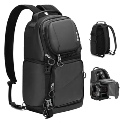 2-in-1 Camera Backpack & Shoulder Bag: This bag has been upgraded from the original version and can now be freely switched between a backpack and a shoulder bag using the zipper on the strap. The buckle at the bottom of the shoulder strap can be freely detached, providing additional 3-point support when carrying it as a shoulder bag to reduce the pressure on your back. Side Access with Safety Buckle: The DSLR camera backpack has a quick side opening design that allows you to remove your camera in a few seconds. The safety buckle prevents accidental opening of the camera compartment and provides extra protection against theft. Slim Body with 9L Adequate Capacity: The interior is divided into two parts, all padded dividers can be reorganized. Top and bottom compartments can be changed into one to even hold any small size handheld stabilizer etc., also there're many pockets for accessories. Side Pocket with Tripod Strap: This camera sling bag has a side pocket and strap for tripod carrying, you can take light stand, tripod, selfie stick stand, water bottle and so on. An ideal camera bag for daily shooting needs. Qualified Material: High quality water-resistant 1200D polyester fabric with high resistance to tearing and abrasion. The hard shell design can effectively protect the internal elements from external damage. A waterproof rain cover for extra weatherproof protection is included.