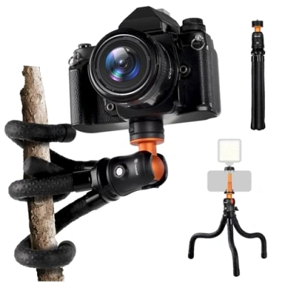 【Unique Hidden Phone Mount】 Easily pull out the phone holder with the press button. Accommodates phones from 60-90mm/2.36-3.54in, with anti-slip foot pads on both ends for added grip. The top of the desktop phone tripod features a universal 1/4 screw, enabling connections to divices like ring lights, cameras, microphones, and more for versatile multi-device work. 【High Weight Capacity & Stable Support】 With a 2kg/4.4lb weight capacity, this octopus tripod effortlessly stabilizes both cameras and smartphones. Crafted from high-strength aluminum alloy ribs and textured leg tubes, the mini tripod offers superior traction. Weighing just 9.9oz, the octopus phone tripod stand guarantees secure support even for larger cell phones. 【Flexible Angle Adjustments】The ballhead of this tabletop phone tripod supports 360° horizontal and 180° vertical rotation, allowing seamless transitions between landscape and portrait with the locking wing screw. The ball head and tube feature a standard 1/4 interface for connections, can also be detached and combined with other equipment for highly customizable setups. 【Convenient Wrapping and Portability】The flex phone tripod's high-strength aluminum alloy keels and flexible, high-resilience rubber surface ensure secure wrapping and fixation on various surfaces and scenario. It collapses to a mere 33cm/13 inches in height and extends max up to 39cm/16.5 inches, easily fitting into your travel essentials. 【Perfect Travel Companion】Featuring waterproof, adaptable, and highly elastic leg tubes that securely warp various surfaces such as backpacks, table edges, doorframes, tree branches and railings. The bottom boasts thickened anti-slip design of the small tripod for camera to prevent accidental sliding. Ideal for outdoor livestreaming, Vlogging, selfies, and a variety of other tasks.