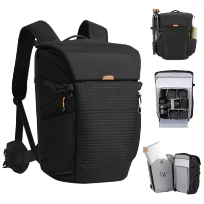 Secure & Convenient Quick Access: This camera backpack features an innovative magnetic flap + hidden zipper combo on the top compartment. Choose between instant access for quick retrieval or dual-layer security based on your needs. The side quick-grab panel offers instant camera access, while the full-open back access with dedicated 16" laptop compartment enables effortless gear organization All-Weather Durability & Scratch Resistance: Constructed with geometric-patterned polyester that resists abrasions and daily wear. Features thickened non-slip rubber base, weather-resistant zippers on critical compartments, and includes a detachable rain cover - ensuring complete protection from all weather Ergonomic Back-support System: Wide padded shoulder straps and ventilation back panel improve airflow by 300% for sweat-free carrying. Paired with the removable waist belt, this large camera backpack evenly distributes weight, reducing shoulder strain during extended hiking or urban shoots 20L Large Capacity: Dual main compartments (convertible to single space for long lenses) hold 1 camera body + 5 lenses plus personal items. Includes 10+ specialized pockets for tripod, water bottle, SD cards, batteries and travel documents. It doubles as a street camera and laptop backpack – keep your camera gears and laptop secure while navigating busy cityscapes Modular Space Design: 7 PVC dividers with 1 security strap create adaptable layouts for various gear combinations. This camera bag backpack offers a customizable and modular space design, allowing you to easily configure the internal space to suit your specific camera gear and accessories. An additional luggage strap is available for travelling purposes