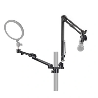 Modular Dual-Arm Set: Titanrig Arm Module Y includes a 18 in lighting arm and a foldable mic boom arm up to 29.4 in. Designed for expanding Titanrig desktop or studio stands in shooting and personal workspace setups. System Compatibility: Works with Titanrig Studio, Titanrig Desk, and Titanrig Desk Lite Z. Connects to 35 mm rods to add lighting and microphone mounting options for photography or studio use. Lighting Arm Support: Aluminum alloy lighting arm supports up to 15.4 lb, suitable for COB lights and other studio gear. Provides stable overhead or side-light placement in compact workstations. Microphone Boom Arm: Articulated mic boom supports up to 3.3 lb/1.5 kg. Adjustable for flexible positioning of microphones in recording, streaming, or studio shooting environments. Plug & Play Setup: Both arms install by sliding onto the main rod from top to bottom and securing with a locking knob. Easy plug and play design for quick Titanrig system expansion.