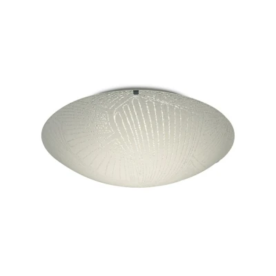 This is a collection of flush round ceiling lights available in two sizes and glass designs. The base framework is polished chrome but the main visible feature of this range is the patterned glass diffuser. The opal glass of the first design is decorated with striking clear textured lines, which are randomly etched across its surface to produce creative feather shapes. The second design displays more uniform lines which symmetrically circle the diffuser like sunrays. The glass encases the 4000K integral LED's, the smaller fitting has a total 12W whilst the larger light is an 18W fixture. This intriguing collection is perfect for a modern low ceiling setting.