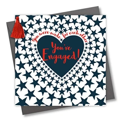 DIMENSIONS: 150x150mm CAPTION: You're Engaged, You were made from each other EMBELLISHMENT: Red Tassel BLANK INSIDE: Space inside for your own message MADE IN THE UK: Designed, printed and finished in the UK HIGH-QUALITY: Printed on top quality heavy 350gsm card stock, with envelope included SUSTAINABLE: Comes wrapped in Compostable bag or with a card catch label. Both the greetings card & envelope are sustainably sourced and recyclable STANDARD LETTER SIZE: Can be sent with Royal Mail standard letter stamps