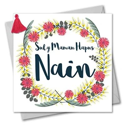 DIMENSIONS: 150x150mm CAPTION: Sul y Mamau Hapus Nain ENGLISH TRANSLATION: Happy Mother's Day, Nanna EMBELLISHMENT: Pink Tassel BLANK INSIDE: Space inside for your own message MADE IN THE UK: Designed, printed and finished in the UK HIGH-QUALITY: Printed on top quality heavy 350gsm card stock, with envelope included SUSTAINABLE: Comes wrapped in Compostable bag or with a card catch label. Both the greetings card & envelope are sustainably sourced and recyclable STANDARD LETTER SIZE: Can be sent with Royal Mail standard letter stamps