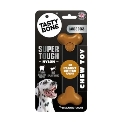 TASTYBONE, ITS IN THE NAME - Your dog's new favourite nylon chew, flavoured to the core and tested on the most aggressive chewers FOR LARGE DOG BREEDS - All dogs are different sizes, make sure to choose a size larger than your dog's mouth PEANUT BUTTER FLAVOUR - Lip-smackingly delicious SAFE NYLON - Made from tough, durable virgin nylon with natural flavour. Other nylon products on the market use chemically-treated, recycled nylon, which could contain contaminants from prior use HEALTHY TEETH & GUMS - Gums and teeth become stronger and healthier with every bite, protecting against infections, tooth-loss and costly vet fees EVERLASTING FLAVOUR - Uniquely infused with irresistible flavours right through to the core. Dogs never get bored, as the flavour lasts the lifetime of the chew toy DELICIOUS & DURABLE - Full of flavour, tough and durable; keeping your dog satisfied and entertained for longer MADE IN THE UK - Supporting British business and made to uncompromising standards of quality GIVE A DOG A BONE - Visit the TastyBone Amazon store and discover the rest of the delicious range to keep your dog happy and tail-waggingly entertained