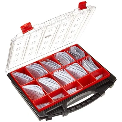 Organiser case with 25 removable compartments Materials. Polypropylene base, polystyrene compartments and lid. Heavy-duty lid reinforced with K-resin, high impact strength. Dimensions. 430 x 370 x 85 mm. B80 compartment, 79 x 55 x 76 mm. Double closure., Manufacturer: Tayg