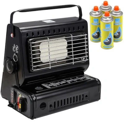 Taylor & Brown 2in1 Portable Gas Heater Stove + 4 Butane Bottles Canisters For Outdoor, Camping, Fishing Caravan Emergency, Safety Grill, Auto Ignition, Carry Handle Temp Control