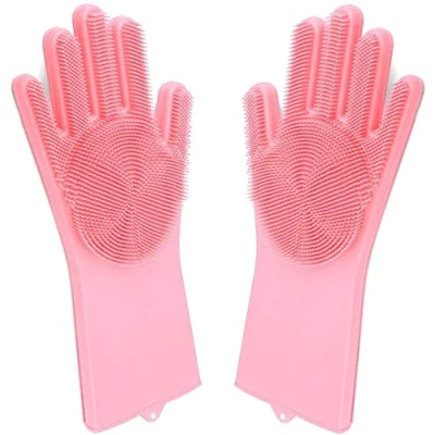 Taylor & Brown Pair of Magic Dishwashing Cleaning Sponge Gloves Reusable Silicone Brush Scrubber Heat Resistant for Kitchen Bathroom Pet Hair Care Car Washing (Pink)