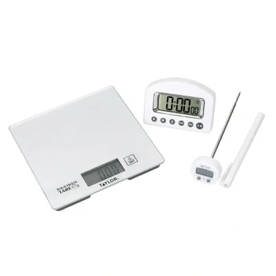 This Taylor Pro 3 piece measuring set includes an ultra thin set of scales, a meat thermometer and a kitchen timer.All finished in a silver finish, the scales features a clear display for easily reading weights and a touchless wave to set the tare back to zero. The scales are stain resistant and can be wiped clean easily after use.The meat thermometer can accurately measure on both °C and °F with instant readings on the LCD display, perfect for cooking meat, fish and making jams.The digital kitchen timer has a 24 hour time range and a memory recall for easily planning timings, complete with a built in magnet and a large screen so it can be displayed in the kitchen.The scales include a 20 year Taylor Pro guarantee and the timer and thermometer both have a 5 year guarantee.