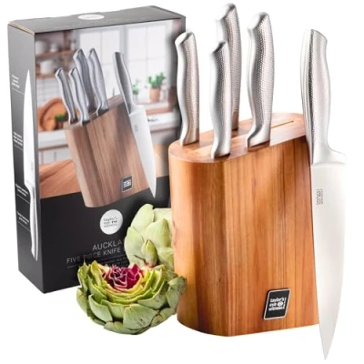 ✅ PRECISION CUTTING – RAZOR-SHARP FOR EFFORTLESS SLICING: Struggling with dull knives that crush instead of cut? Our 5-piece kitchen knife set features precision taper-ground stainless steel blades, delivering ultra-sharp edges for seamless cutting. Whether you’re chopping vegetables, carving meat, or slicing bread, these kitchen knives ensure smooth, clean cuts every time—because cooking should be a joy, not a struggle! ✅ ERGONOMIC & HYGIENIC DESIGN – SEAMLESS CONSTRUCTION FOR COMFORT: Tired of knives that feel uncomfortable or trap food? These kitchen knives are designed with a hygienic, seamless construction—no food traps, no hassle. The tactile hammered grip texture enhances control and provides a secure, comfortable grip for precise cutting. Enjoy fatigue-free cooking with professional-grade precision! ✅ VERSATILE 5-PIECE SET – MEETS ALL YOUR KITCHEN NEEDS: Why clutter your kitchen with unnecessary knives? This knife set with block includes a paring knife, utility knife, carving knife, bread knife, and a 20cm chef's knife—covering all your slicing, dicing, and chopping needs. Whether you’re prepping delicate ingredients or tackling tougher cuts, this multipurpose kitchen knife set is designed for home cooks and chefs alike. ✅ ELEGANT ACACIA WOOD BLOCK – SAFE STORAGE & MODERN AESTHETIC: Store your knives in style with the real acacia wood knife block, designed for safe storage and easy access. The high-quality acacia wood resists moisture, helping to protect and preserve the sharpness of your blades. Its sleek, space-saving design adds a modern touch to any kitchen while keeping your knives organised and within reach. This sturdy, elegant block enhances both functionality and aesthetics. Flimsy knives that rust or dull quickly can ruin your cooking experience. Our stainless steel blades maintain their sharp edge and resist corrosion, ensuring long-lasting performance. Built for both home cooks and professionals, this set of knives deliver precision, durability, and reliability, making meal prep effortless for years to come., Manufacturer: Taylors Eye Witness