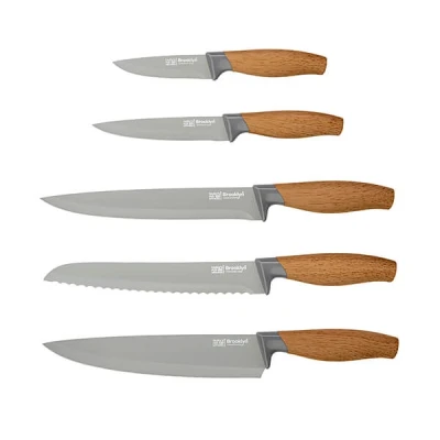 This Taylor's Eye Witness Brooklyn Beech 5 Piece Kitchen Knife Set includes a paring, an all purpose knife, 20cm chef's knife, carving knife and a bread knife.Ideal for everyday food preparation, the blades are made from stainless steel with a soft touch beech look handle.PFAS-Free easy clean non stick coating.  Knives are not for sale to persons under the age of 18. - all knives and bladed products are delivered by Age Verified Delivery (AVD). The carrier may request proof of age in order to deliver your parcel. If proof of age is not available, or the recipient is underage, the carrier will refuse to deliver.