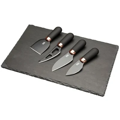 The Brooklyn Copper Slate Cheese Board Set from Taylor's Eye Witness includes 4 essential cheese knives and a 30cm x 20cm natural slate cheese board.The knives are finished in contemporary black with contrasting copper effect bolster and have and antibacterial ceramic coating.The set includes: Flat Cheese Knife, Soft Cheese Knife, Hard Cheese Knife and a Parmesan Knife.The ergonomic handles have a soft-grip finish offering extra control and comfort.The cheese knives are dishwasher safe (though hand washing is recommended) and comes with a Taylor's Eye Witness 2 year guarantee.  Knives are not for sale to persons under the age of 18. - all knives and bladed products are delivered by Age Verified Delivery (AVD). The carrier may request proof of age in order to deliver your parcel. If proof of age is not available, or the recipient is underage, the carrier will refuse to deliver.