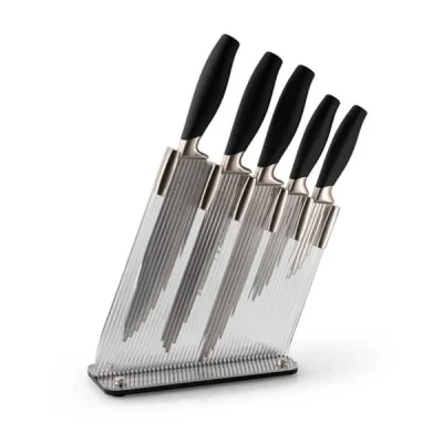 The Taylor's Eye Witness Brooklyn Nickel 5 Piece Knife Block Set is a stylish and practical addition to any kitchen, combining modern design with exceptional performance.Housed in a striking reeded acrylic-glass knife block, this elegant set includes five essential kitchen knives – ideal for everything from slicing and dicing to carving and bread cutting.Each knife features a super-sharp hollow ground blade with a precision-honed cutting edge for outstanding sharpness and edge retention. The nickel-coloured bolsters add a contemporary touch, while the soft-touch handles offer comfort and control during use.Set includes:Paring Knife – ideal for peeling and intricate workUtility Knife – perfect for prepping fruits and vegetablesCarving Knife – for smooth, precise slicing of meatsBread Knife – with a serrated edge for crusty loaves20cm Chef's Knife – a versatile all-rounderEasy to sharpen and designed for everyday use, this knife set is a reliable kitchen companion. Supplied in recyclable packaging and backed by a 2-year manufacturer’s guarantee for peace of mind.