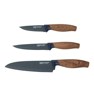 This Taylor's Eye Witness Brooklyn Walnut 3 Piece Kitchen Knife Set includes a paring knife, an all purpose knife and a 6.5 santoku knife.Ideal for everyday food preparation, the blades are made from stainless steel with a soft touch walnut look handle.PFAS-Free easy clean non stick coating.  Knives are not for sale to persons under the age of 18. - all knives and bladed products are delivered by Age Verified Delivery (AVD). The carrier may request proof of age in order to deliver your parcel. If proof of age is not available, or the recipient is underage, the carrier will refuse to deliver.