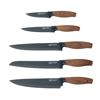 This Taylor's Eye Witness Brooklyn Walnut 5 Piece Kitchen Knife Set includes a paring, an all purpose knife, 20cm chef's knife, carving knife and a bread knife.Ideal for everyday food preparation, the blades are made from stainless steel with a soft touch walnut look handle.PFAS-Free easy clean non stick coating.  Knives are not for sale to persons under the age of 18. - all knives and bladed products are delivered by Age Verified Delivery (AVD). The carrier may request proof of age in order to deliver your parcel. If proof of age is not available, or the recipient is underage, the carrier will refuse to deliver.