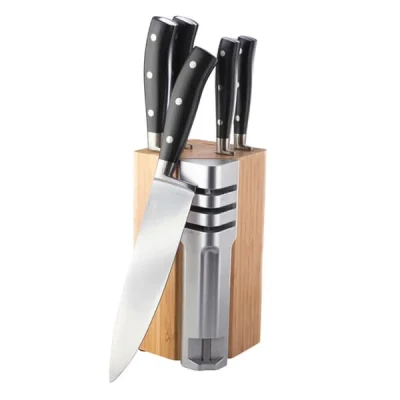 If worktop space is tight, this Taylor's Eye Witness Henley 5 Piece Bamboo Knife Block Set with Detachable 3 Stage Knife Sharpener could be the answer to your knife block needs. The space saving lacquered bamboo knife block is even more impressive thanks to the integrated 3-stage knife sharpener which ensures your knives are always razor sharp.Included with this set are 5 essential kitchen knives including a paring knife, all purpose knife, carving knife, bread knife and a 20cm chef's knife. Each knife features a taper ground blade with a full-tang handle construction for added durability and balance. The knives are finished with classic triple riveted handles.The knives in this Taylor's Eye Witness Henley kitchen knife set are dishwasher safe (though hand washing is recommended).The Taylor's Eye Witness Henley 5 Piece Bamboo Knife Block Set with Detachable 3 Stage Knife Sharpener is supplied with a manufacturer's 10 year guarantee.  Knives are not for sale to persons under the age of 18. - all knives and bladed products are delivered by Age Verified Delivery (AVD). The carrier may request proof of age in order to deliver your parcel. If proof of age is not available, or the recipient is underage, the carrier will refuse to deliver.