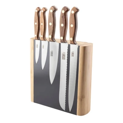✅ HIGH QUALITY MAGNETIC BLOCK: The knife block is made from solid bamboo with a magnetic plate on both sides. For stability, the knife block, on its own, weighs over 2.5kg. Includes 7.5cm Paring knife, 10cm All-Purpose knife, 15cm Chef’s knife,20cm Carving knife & 23cm Bread knife. Ground in Sheffield by skilled craftspeople. Sleek black composite water resistant handles give hardwearing longevity. Full tang design balance and comfort with brass rivets and a stainless steel sleek long blade. ✅ GOOD ENOUGH FOR PROFESSIONALS: Each knife blade is made from high carbon steel.The traditional antique brass rivets with the modern silver coloured sheen of the blade would suit both contemporary and traditional farmhouse kitchen alike. Ground in Sheffield by skilled craftspeople for superior cutting edge. A must-have for your home kitchen. Composite water resistant handles give hardwearing longevity. These knives will not let you down! ✅ AWARD WINNING: This block has a classic design, which won The Design Council Award for ‘An Outstanding British Product’. It will look great in any type of kitchen, at home or in a commercial environment. The knives are have ergonomically designed scales whose end stop ensures a secure non-slip grip. Their full tang design means they are well balanced for comfort even after prolonged use. The knives symmetry gives suitability for both right and left-handed users. Great for everyone. ✅ HEALTH & HYGIENE: The surface of the block is wipe clean and because the knives stick to the sides there are no places for crumbs or food particles to hide or get stuck in. This is the most hygienic and easiest way to store your knives in any busy kitchen. Knives are best used on wooden or plastic chopping boards/surfaces to prevent any unnecessary damage. ✅ LIFETIME GUARANTEE: Taylor’s Eye Witness have been making knives for over 150 years - we are so proud of our craftsmanship that we guarantee the tools in the UK made Heritage range for life. In the unlikely event that your knife becomes defective under normal kitchen use and following care instructions provided, it will be repaired or replaced without charge., Manufacturer: Taylors Eye Witness