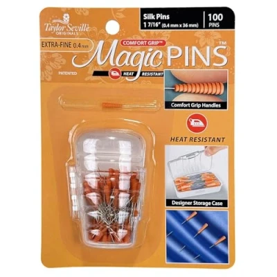 Magic Pins Are So Easy To Use-Comfort Grip Handles Are Easy To Grip And Work With Heat Resistant-The Comfort Grip Handles On These Pins Are Heat Resistant Designer Storage Case-SILK EXTRA FINE Comfort Grip Pins Come In A Clear, Plastic Designer Case That Is Attractive And Convenient Magic Pin Dimensions-Comfort Grip Magic Pins SILK EXTRA FINE are 1 7/16 inch and .4mm In Diameter Exclusively From Taylor Seville Originals-The Comfort Grip Magic Pins SILK EXTRA FINE Are Manufactured By Taylor Seville Originals, An Established And Innovative Sewing And Crafting Company Committed To Providing Fine Quality Sewing, Beading And Quilting Supplies