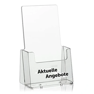 Opening dimensions (inside): 10.9 cm; filling depth (inside): 3.2 cm; height (overall): 18 cm Includes 5C high-end UV digital German text print "Aktuelle Angebote" - black writing on white background Colour of brochure holder: Transparent Material: Polystyrene