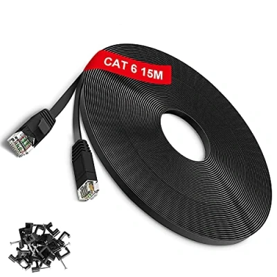 TBMax 15m Ethernet Cable Cat6, Flat Network High Speed 1Gb 250MHz Gigabit LAN with RJ45 Connectors, Long Internet UTP Patch Cables for Modem, Router, Switch, CCTV, Black