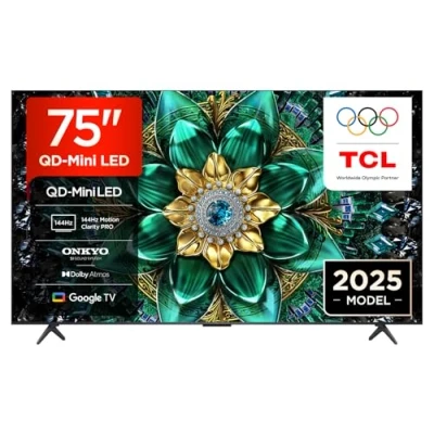 TCL 75Q6C UK QD Mini LED TV, 4K HDR Premium 1000nits, Smart TV Powered by Google (Dolby Vision IQ & Atmos, Onkyo 2.1 Sound System, 144Hz Motion Clarity Pro, Game Master, 2025 New Model)